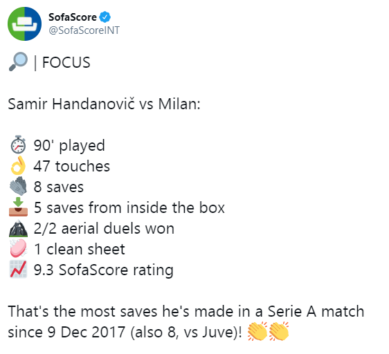 Kaj poreči o Milanovi vsebini? Samooklicanemu nogometnemu bogu Zlatanu in soigralcem z izjemo jalove premoči v posesti ni šlo veliko od nog. Pri neutrudnih poskusih topljenja tekmečeve prednosti pa so naleteli na previsoko oviro še v podobi nekdanjega slovenskega reprezentančnega vratarja. Samir Handanović je v slabi minuti na uvodu drugega polčasa veličastno ukrotil Ibrahimovićeva projektila, lesk novega Sarminega sijajnega dne v pisarni pa je po prebrisano izvedenem strelu spoznal še Sandro Tonali.