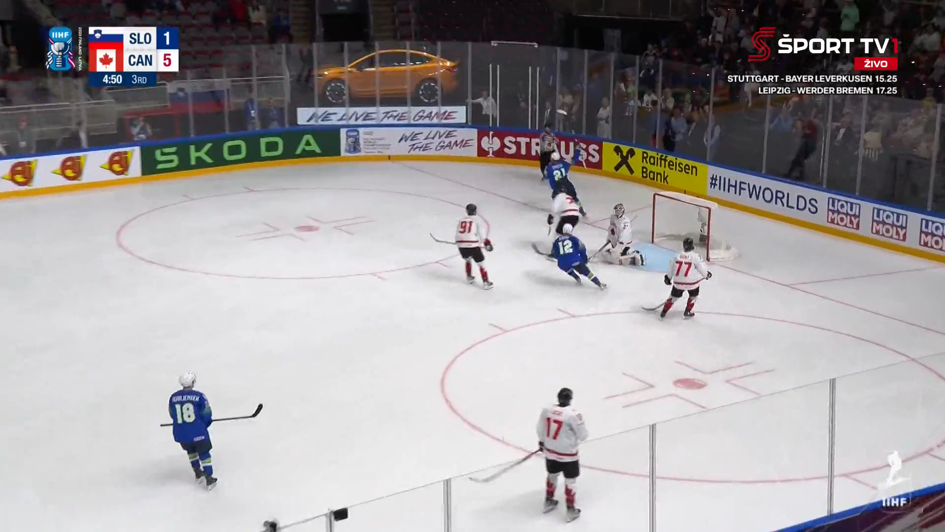 Slovenska hokejska reprezentanca je v drugi tekmi svetovnega prvenstva elitne skupine v Latviji in na Finskem izgubila s Kanado. V Rigi je danes klonila z 2:5 (1:0, 0:3, 1:2).
