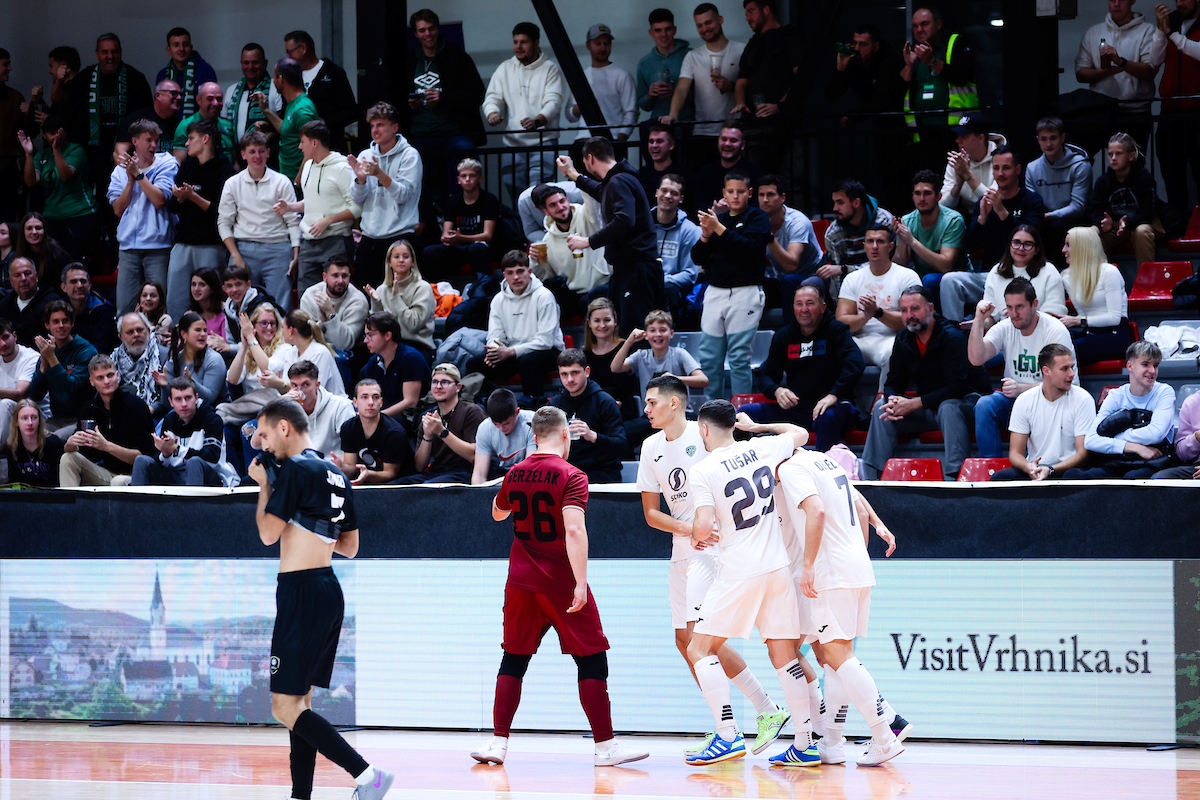 Dvoboj z makedonsko ekipo so Vrhničani začeli odlično, Jakob Rems je v tretji minuti po hitrem protinapadu preigral še vratarja in zadel za vodstvo. Nekaj minut zatem je Tod Ciuha vodstvo povišal in domači so imeli v rokah navidez trdno vodstvo. A v končnici prvega dela so pobudo prevzeli gostje, najprej je Jesus Rivas s strelom pod prečko presenetil vratarja Nejca Berzelaka, le 17 sekund pred koncem prvega dela pa je pred svojim golom žogo po strelu tekmecev v lastno mrežo preusmeril Timotej Debeljak.